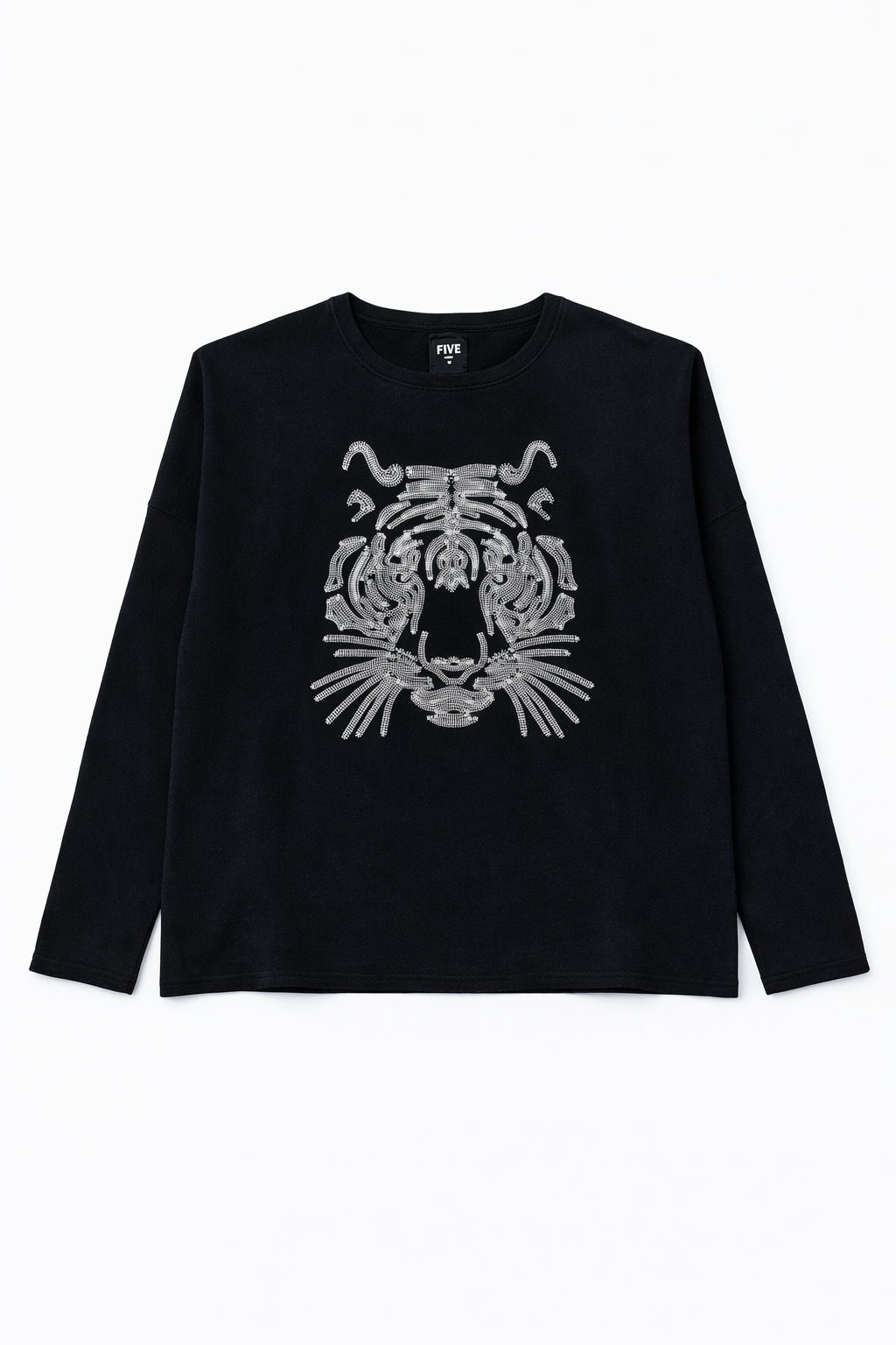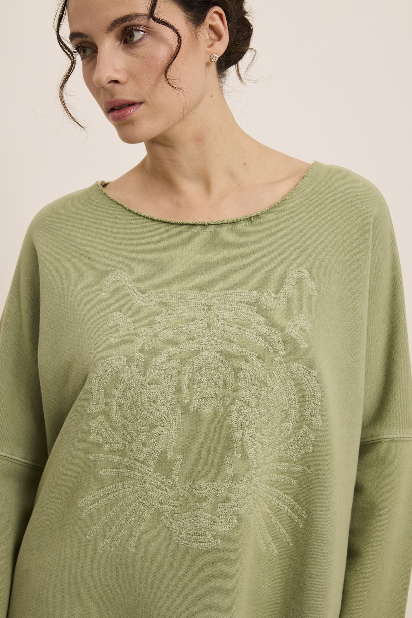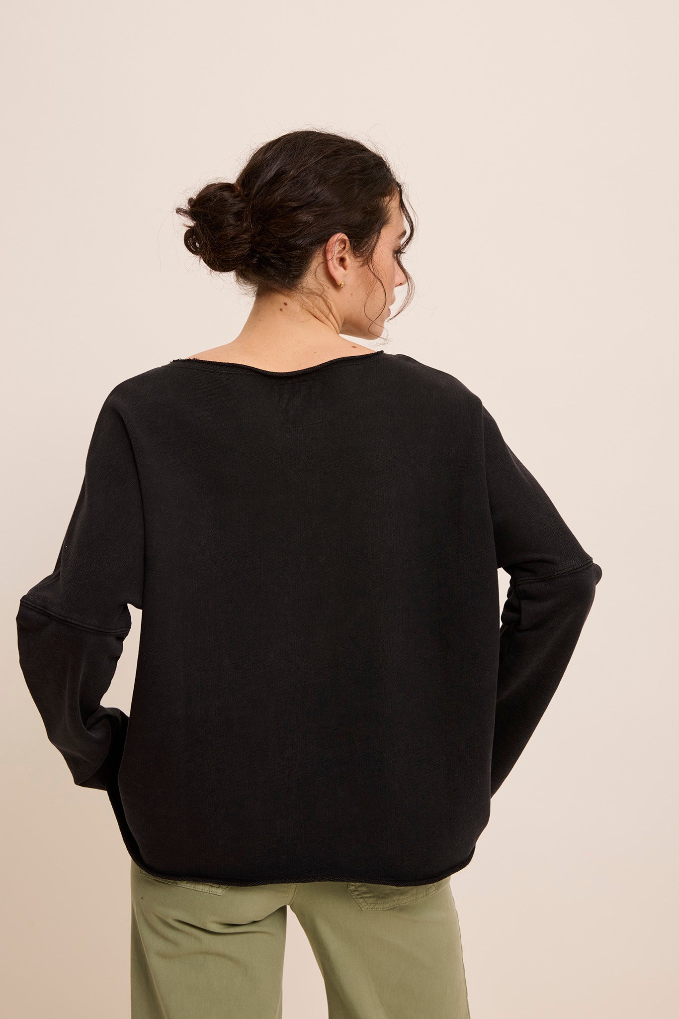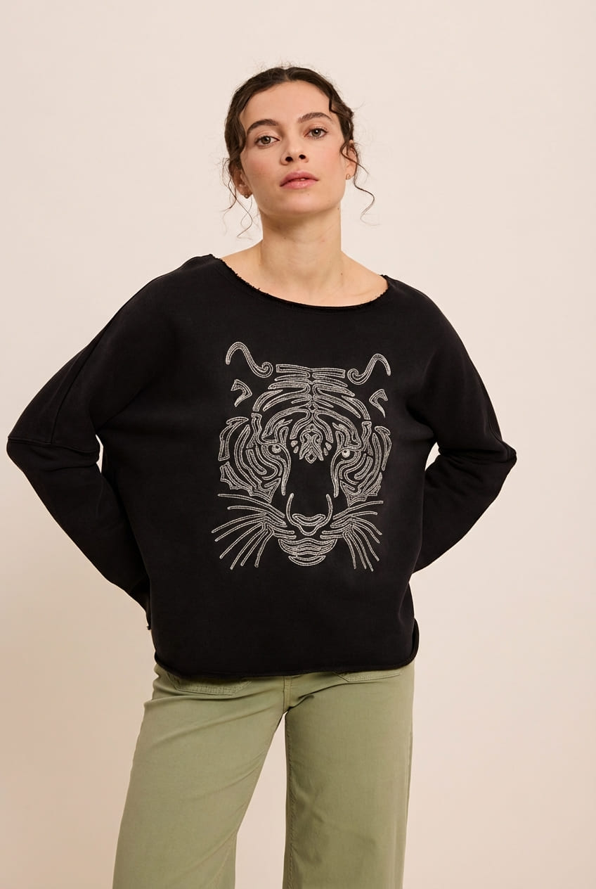 Notre mannequin porte ce sweat en taille S que vous pouvez facilement associer avec un de nos pantalons.