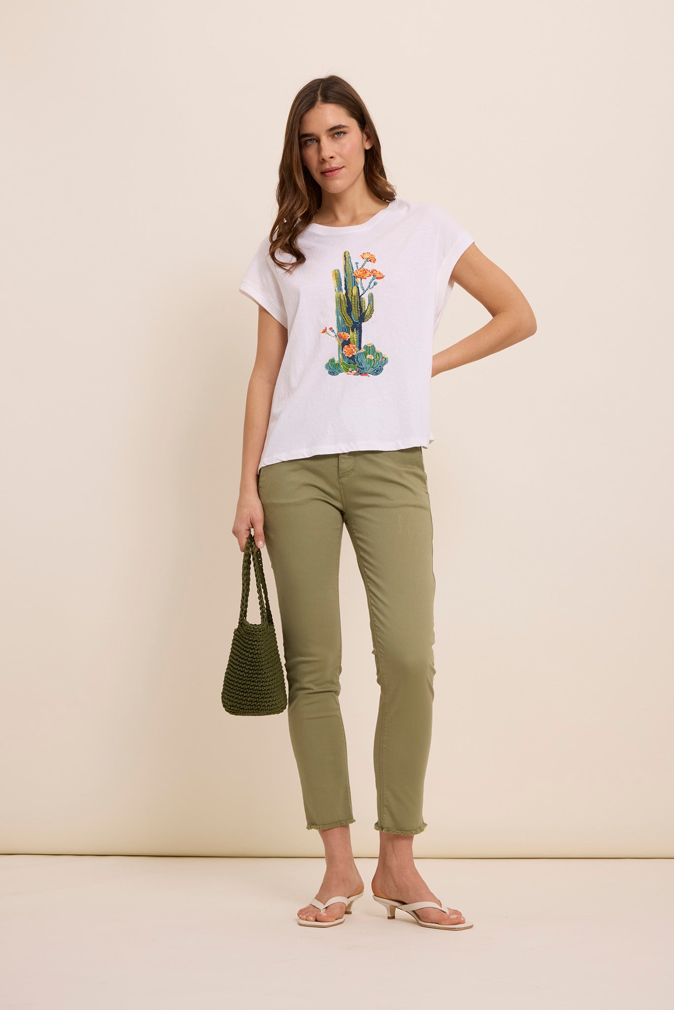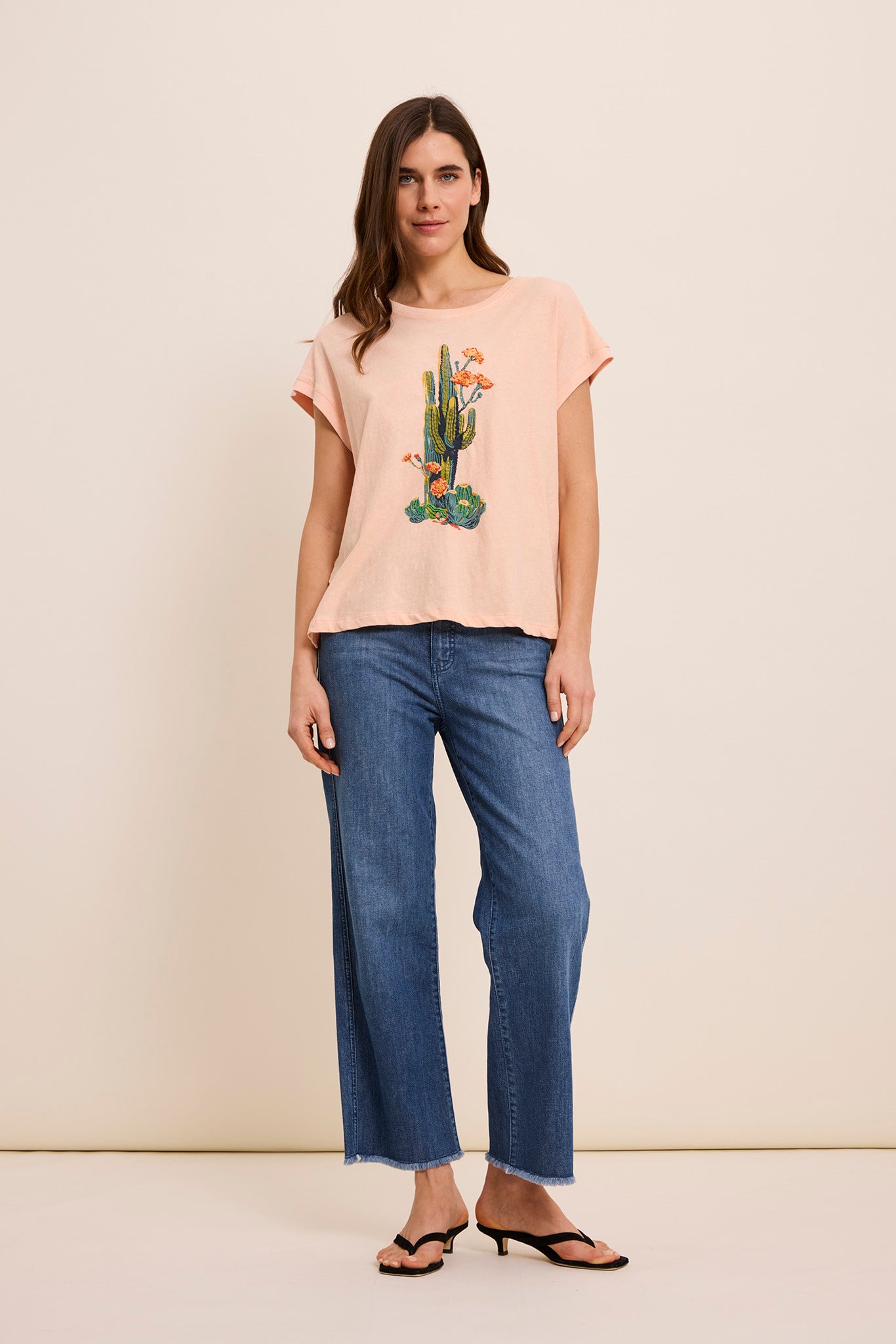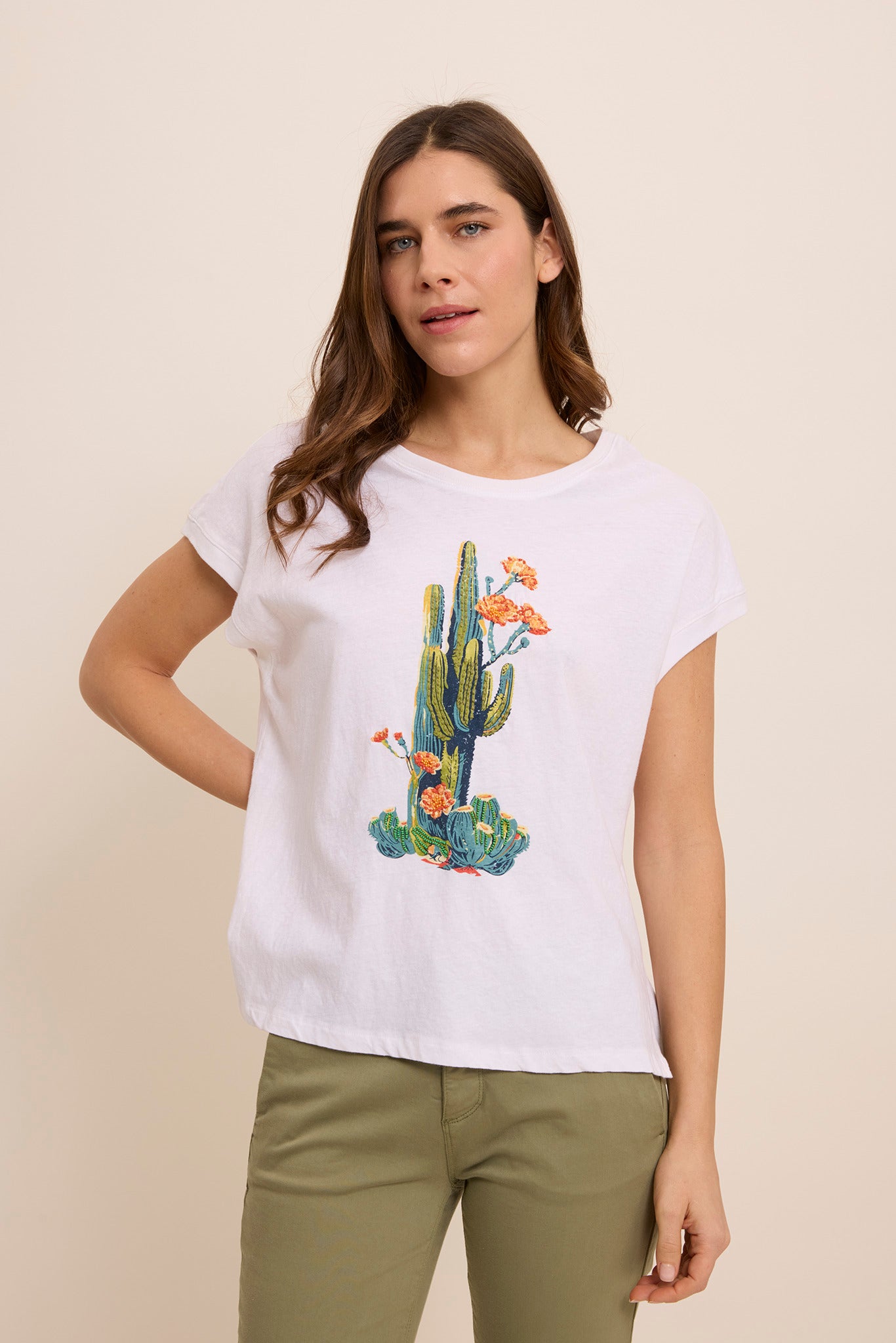 Notre mannequin porte ce tee-shirt en taille S que vous pouvez facilement associer avec une de nos jupes ou de nos jeans.