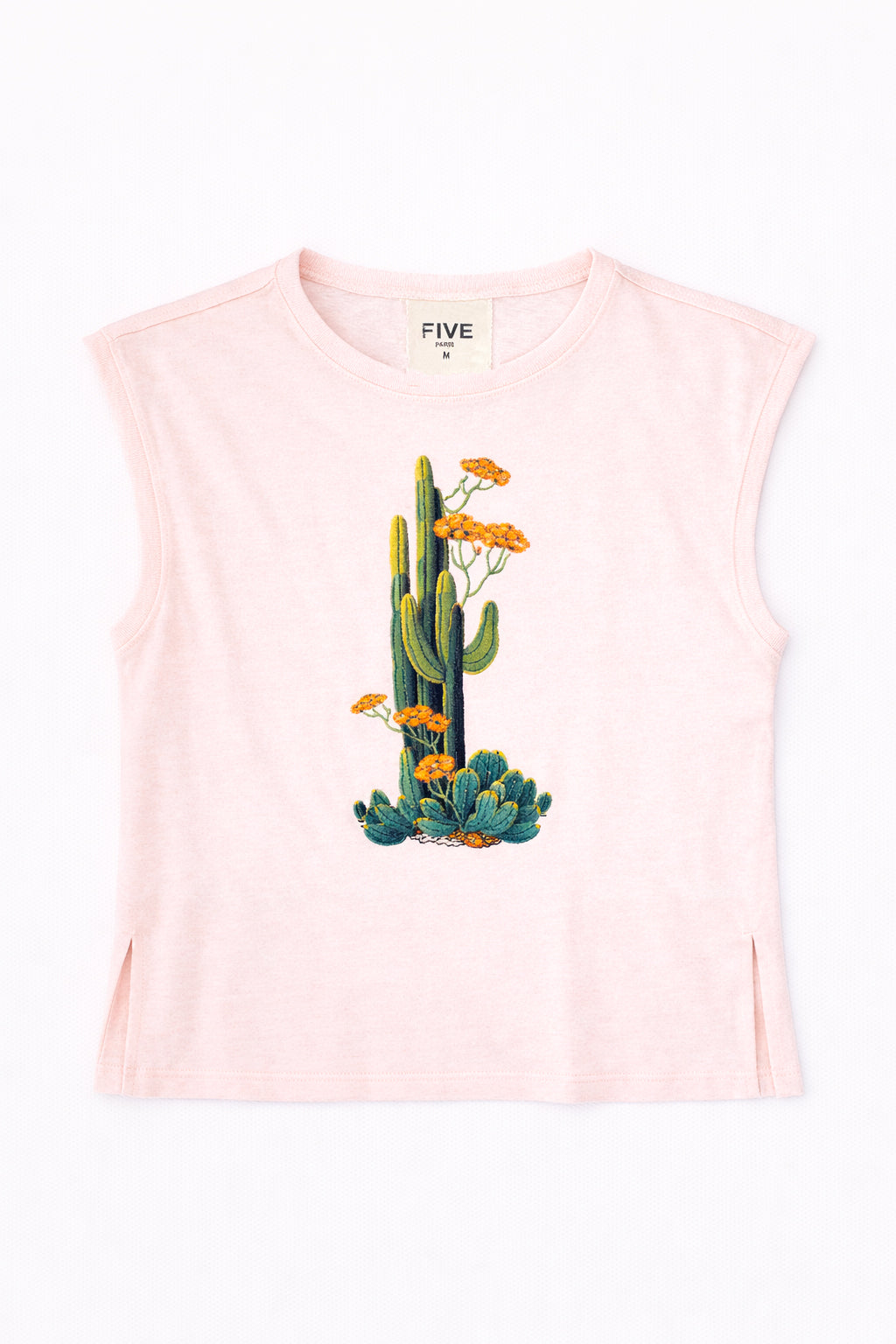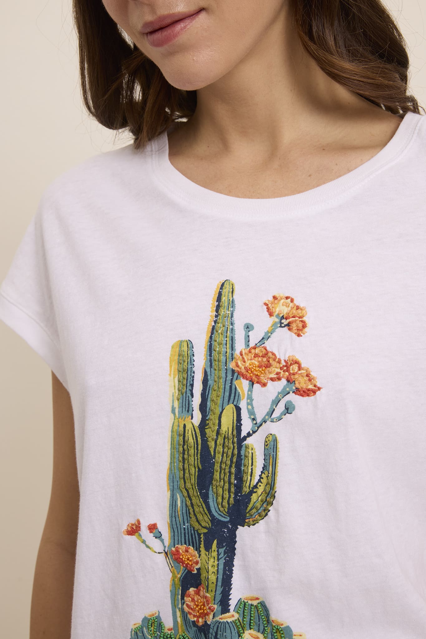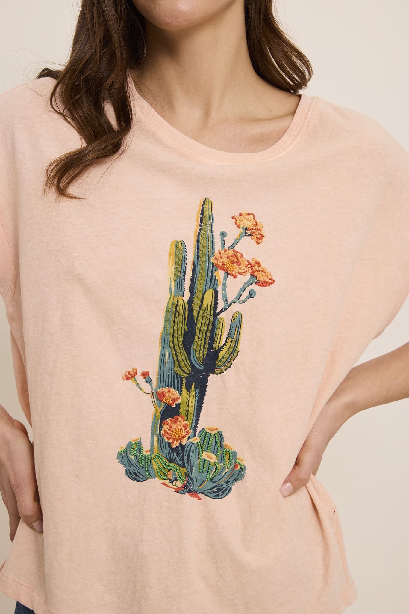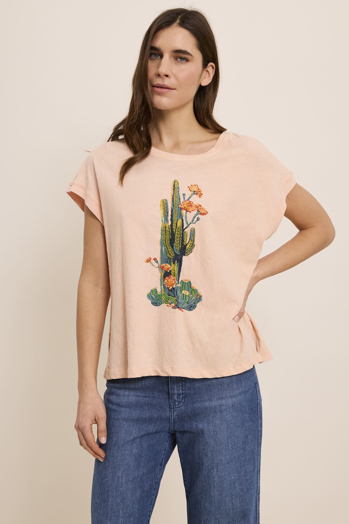 Notre mannequin porte ce tee-shirt en taille S que vous pouvez facilement associer avec une de nos jupes ou de nos jeans.