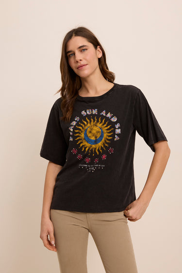 Notre mannequin porte ce tee-shirt en taille S que vous pouvez facilement associer avec une de nos jupes ou jeans.