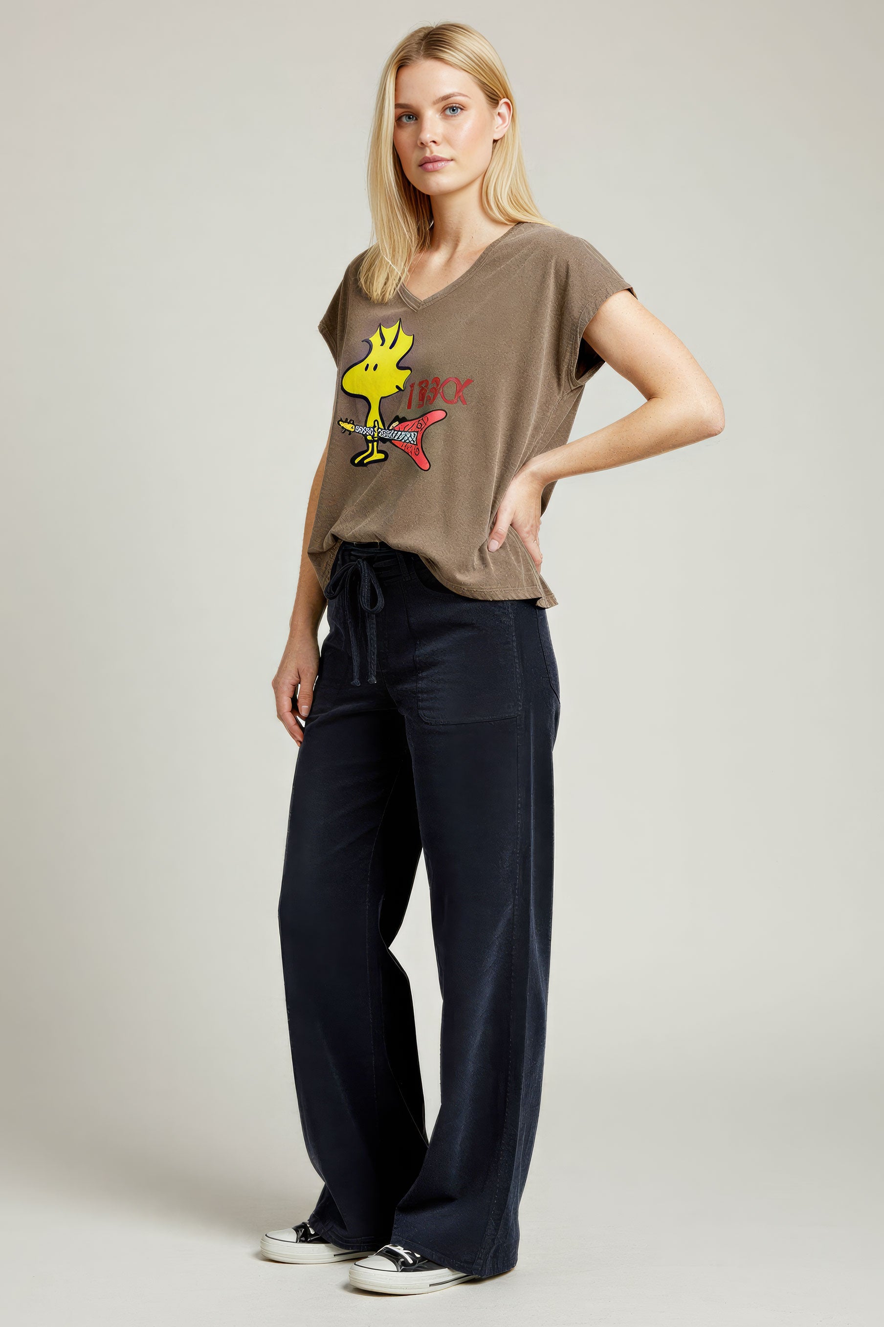 Our model is wearing this t-shirt in size S which you can easily pair with one of our pants .