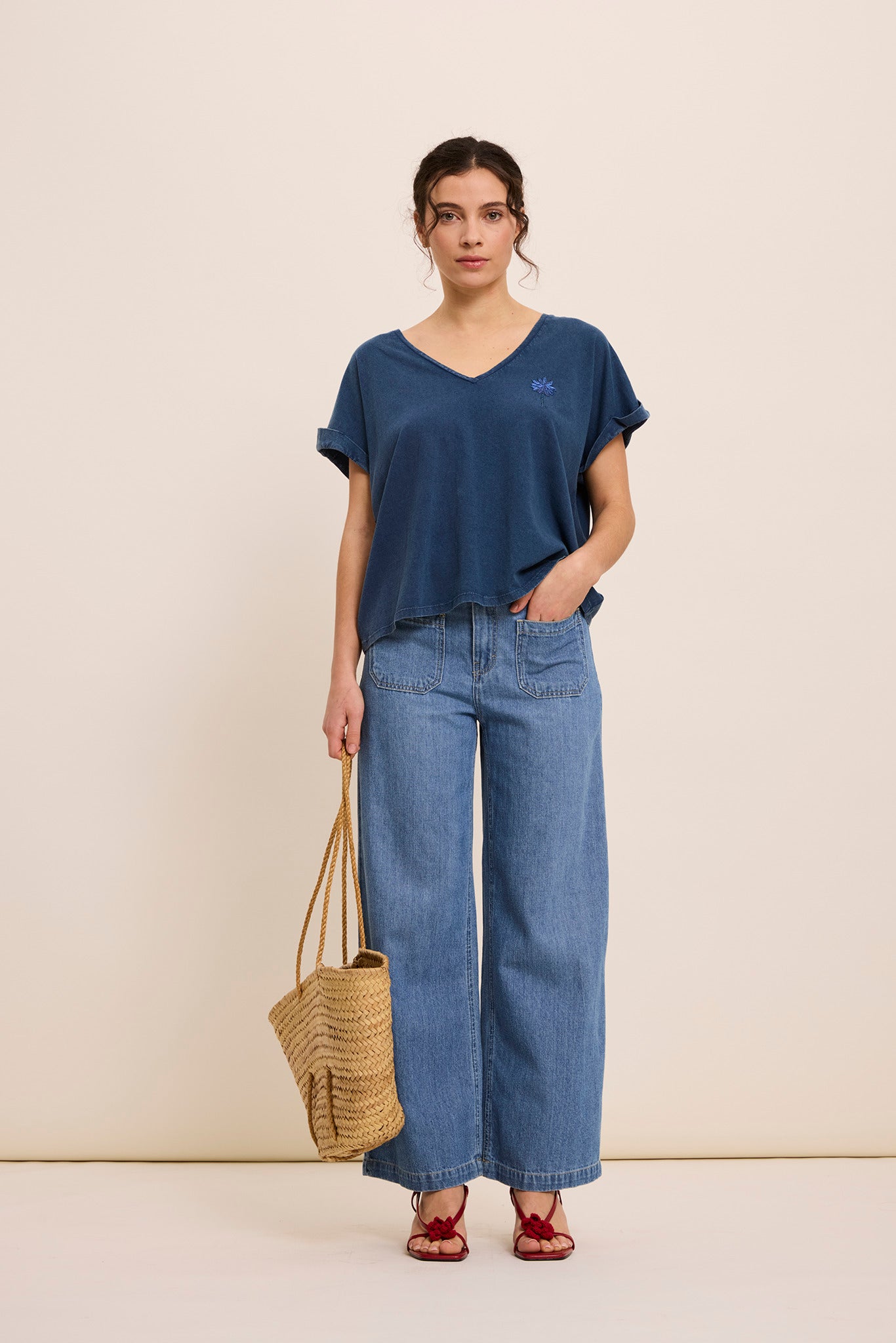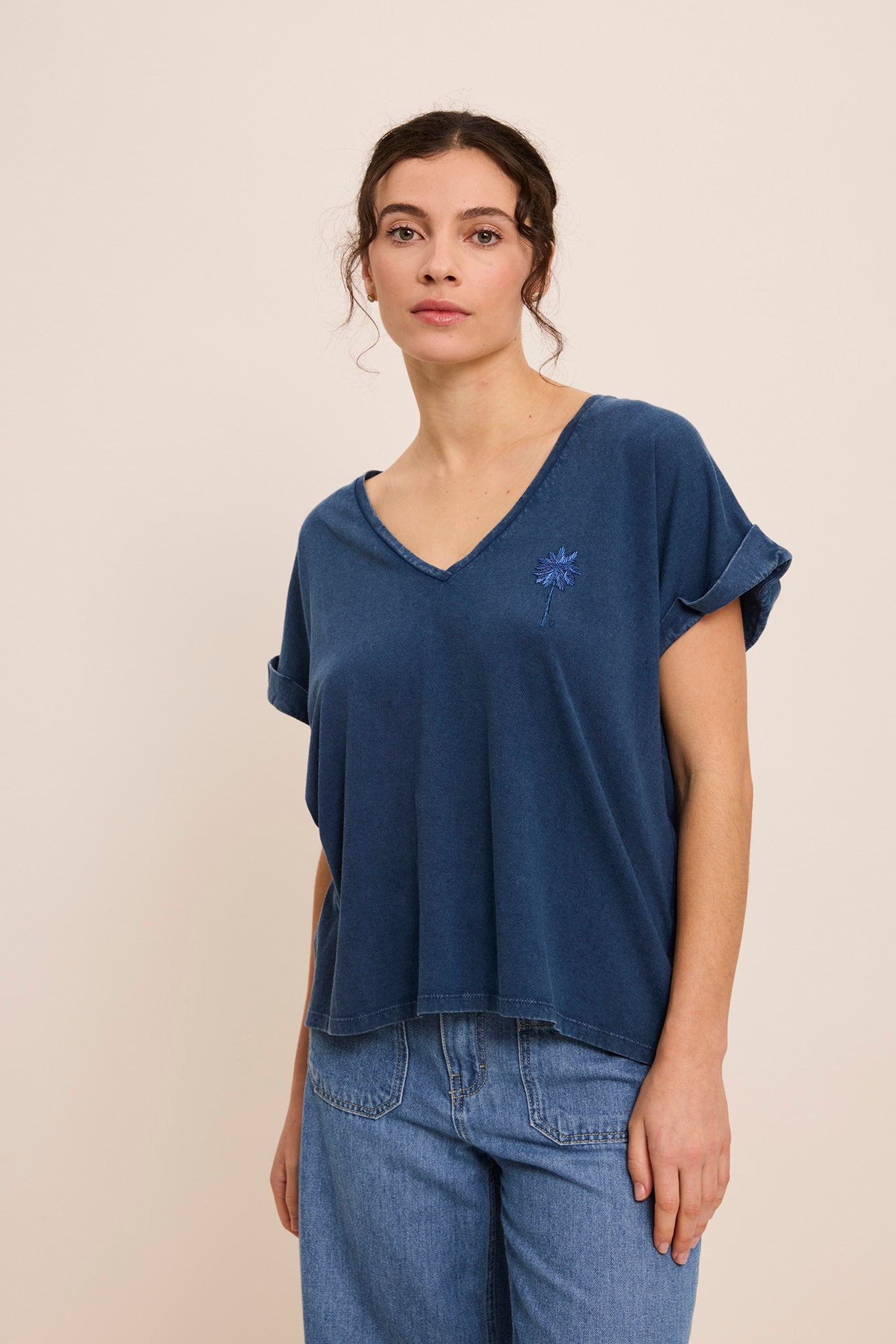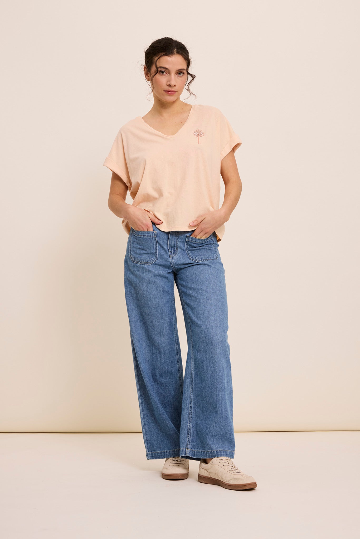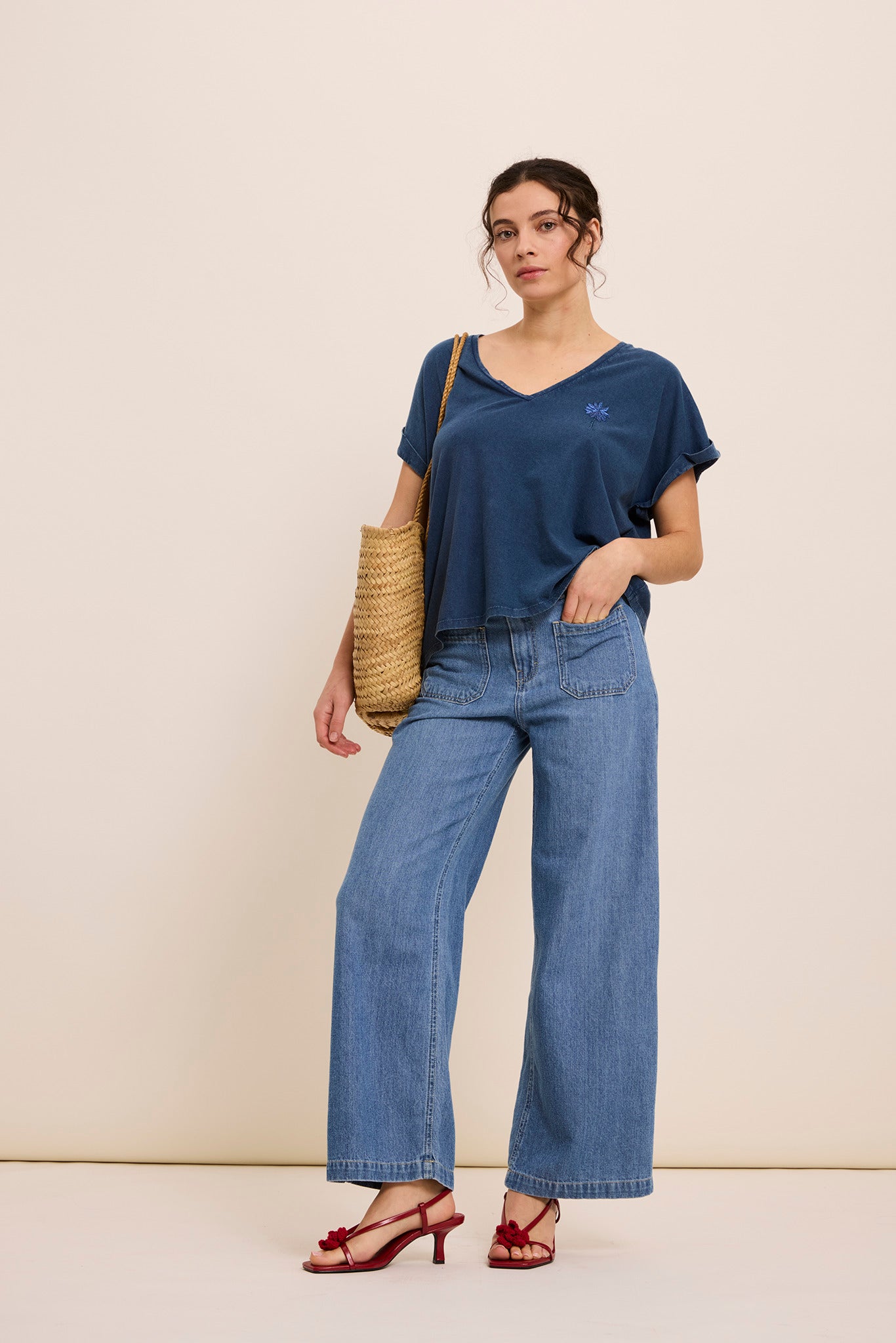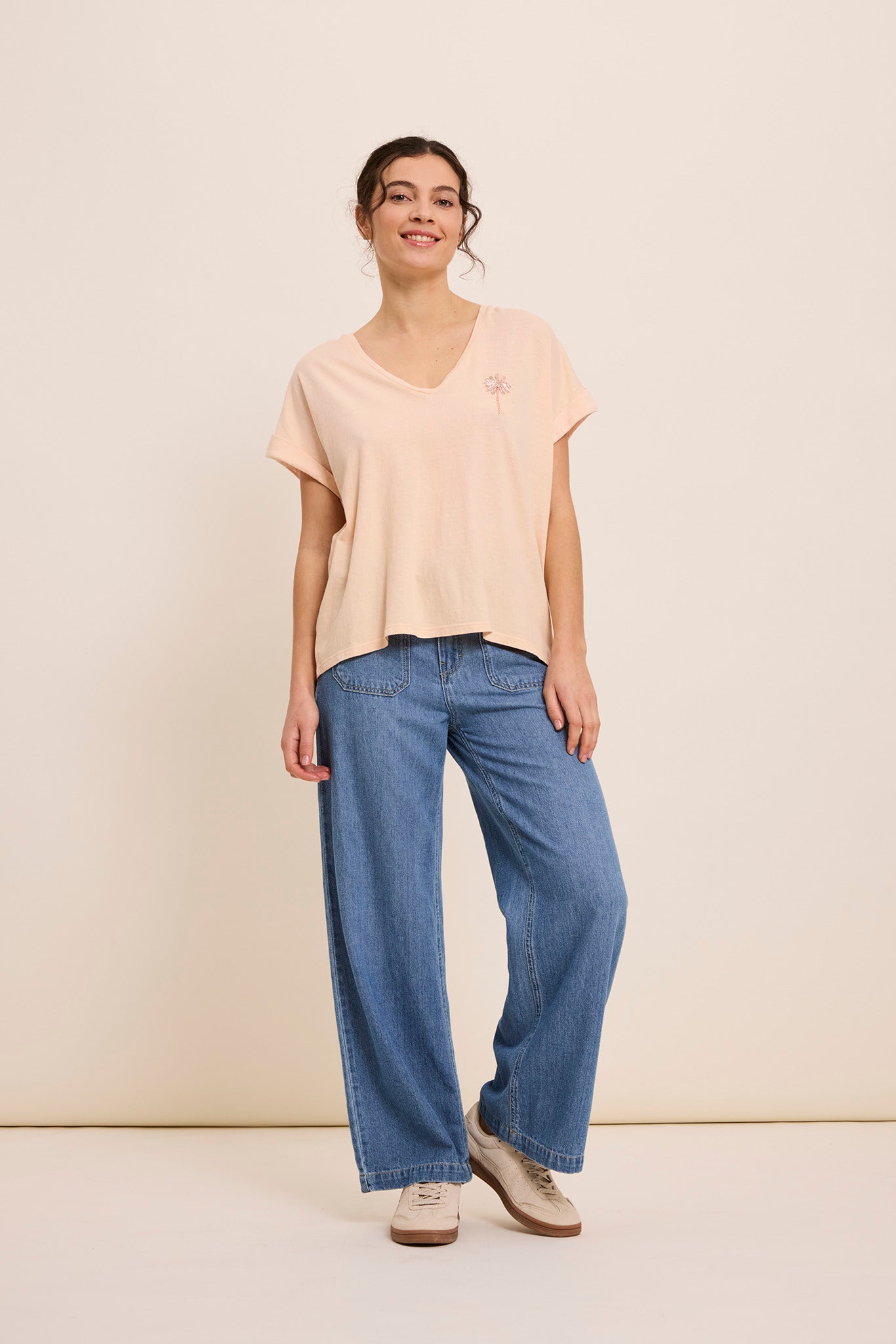 Our model is wearing this t-shirt in size S which you can easily pair with one of our skirts or jeans .