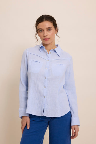Nuestra modelo lleva esta camisa en talla S que podrás combinar fácilmente con uno de nuestros pantalones .