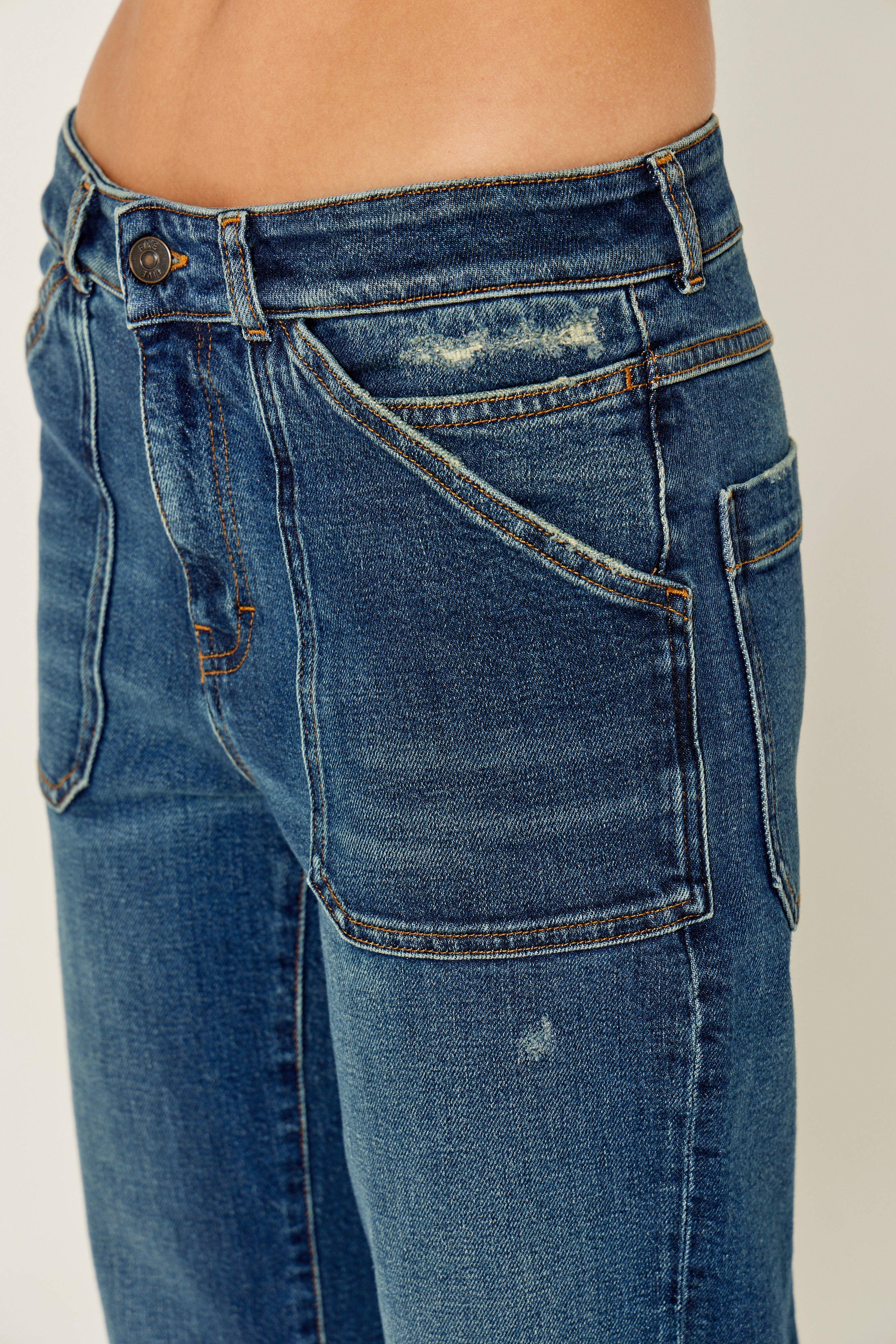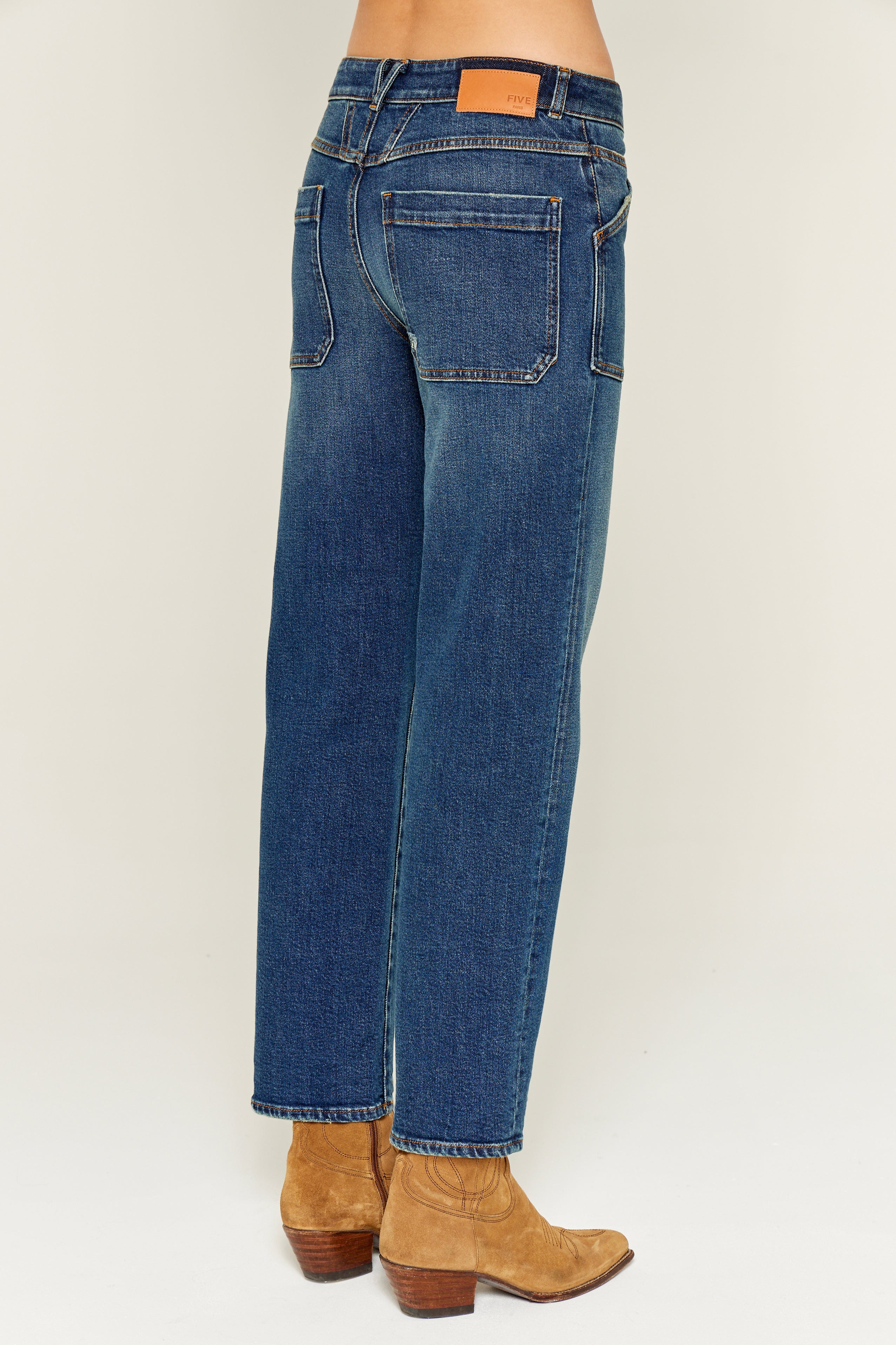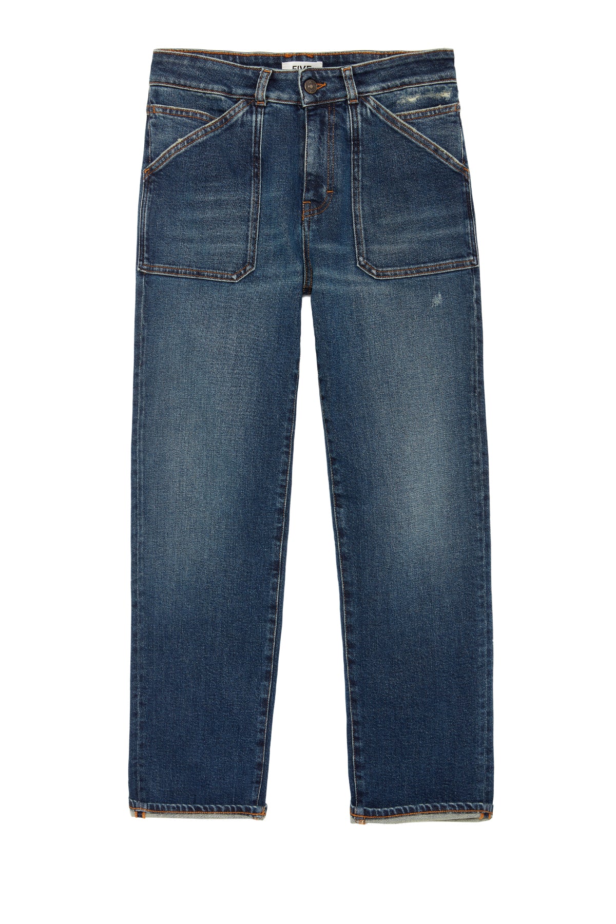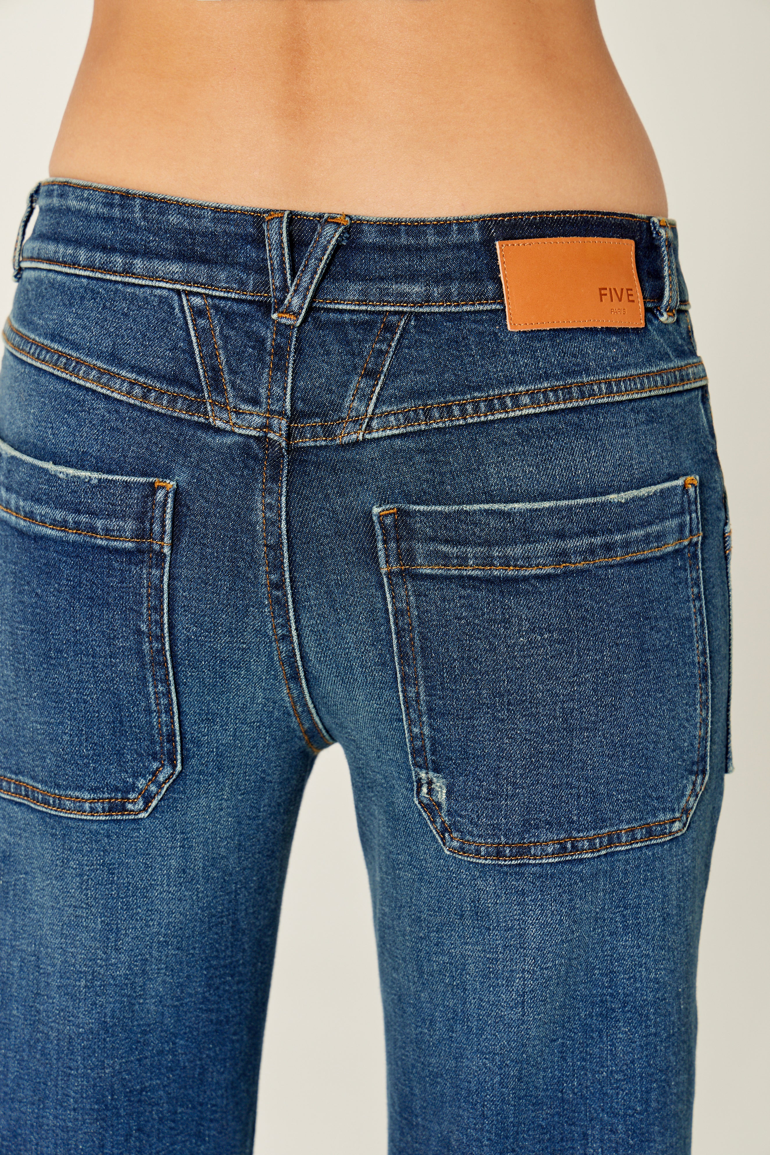 - Cierre con botón de la marca FIVE y cremallera oculta bajo la solapa.